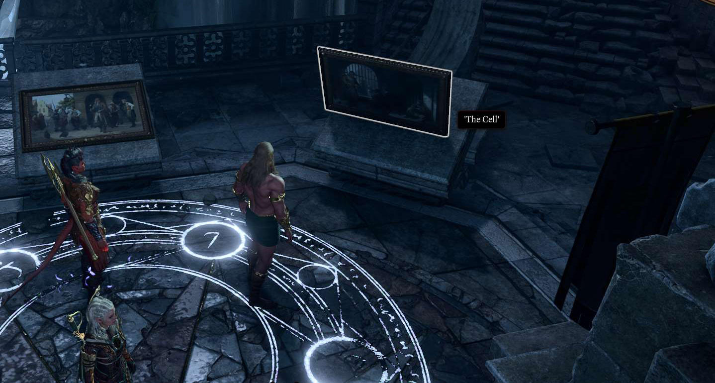 우선 퍼즐 앞에 있는 발두란의 석상과 상호작용하세요. 그런 다음 퍼즐을 둘러싼 모든 석판에 저주 제거(Remove Curse) 주문을 시전하고 그 곳의 그림을 관찰하세요. "The Hanging", "Freedom", "The Cell" 이라는 세 개의 그림이 있는데 The Cell이라는 그림을 집어 들고 맞은편에 있는 빈 받침대로 옮기면 퍼즐은 해결됩니다.