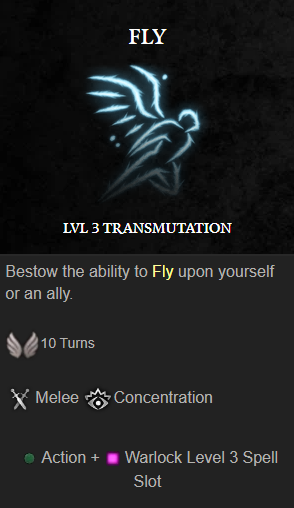 날아오르기에는 막대한 비용이 들지만 플레이어는 이 주문을 통해 플레이어가 수평 및 수직으로 먼 거리를 이동할 수 있다는 점을 기억해야 합니다. 이를 통해 주문 시전자 또는 선택한 동맹이 주문을 시전하고 공격을 시작하기 위해 보다 효율적인 유리한 지점에 착륙할 수 있습니다. 게다가 플라이의 10턴 지속 시간은 훨씬 저렴한 미스티 스텝의 다중 캐스트를 능가합니다.