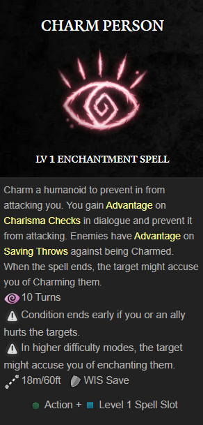 설명 : 인간형을 매혹하여 공격하지 못하도록 합니다. 대화에서 카리스마 체크 에 이점을 얻고 공격을 방지합니다.