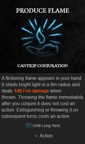 설명 : 깜박이는 불꽃이 손에 나타납니다. 9m 반경에 밝은 빛을 비추고 던질 때 1d8 화염 피해를 입힙니다. 당신이 불을 불러낸 직후에 불을 던지는 것은 행동을 요구하지 않습니다. 다음 턴에 불을 끄거나 던지면 행동이 필요합니다.
