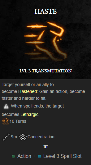 헤이스트의 가장 좋은 사용자는 메타매직: 트윈 스펠을 사용하여 대상 지정 주문이 두 명의 사용자에게 영향을 미치도록 할 수 있는 마법사입니다. 패치 9부터 헤이스트는 이제 캔트립 시전을 두 배로 늘리거나 서두른 캐릭터가 턴당 발동할 수 있는 추가 공격을 두 배로 늘립니다.