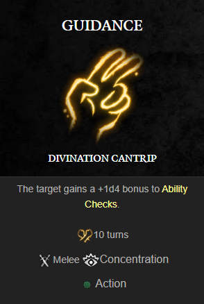 가이던스를 사용하면 대상은 이제 능력 검사에 +1d4를 얻습니다. 이 보너스는 처음에는 그다지 많지 않을 수 있지만 목표가 달성할 수 있는 거의 모든 롤에 영향을 미치는 능력은 이것을 바딕 인스퍼레이션과 동일하게 만듭니다. 안내는 다른 보너스와 결합하면 캐릭터가 능숙하지 않은 스킬이나 다목적 무기로 근접 공격을 할 때에도 캐릭터를 강자로 변신시킬 수 있습니다 .