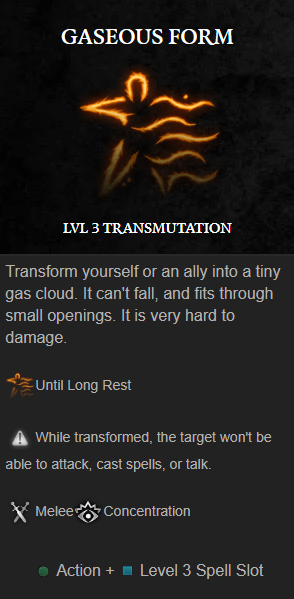 탐험하는 동안 작은 구멍에 들어갈 수 있는 동료가 없는 경우 이러한 위치를 만날 때 실망할 수 있습니다. 기체 형태 덕분에 대상은 시전자의 집중이 끝날 때까지 말하거나 공격하거나 주문을 시전할 수 없는 가스 구름이 됩니다. 기체 형태는 탐색 도구가 되는 것 외에도 상황을 벗어나는 데 유용한 도구가 될 수 있습니다.