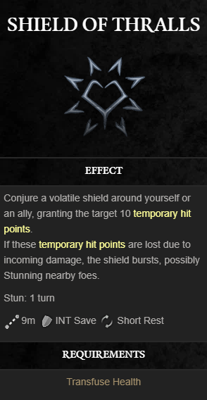 이 파워의 핵심은 시전자 또는 동료에게 10 임시 HP를 제공합니다. 이것은 충분히 간단해 보이지만 이 Temp HP 능력은 10 Temp HP를 고갈시키면 INT Save에 실패할 경우 적을 기절시킬 수 있는 폭발을 방출하는 주문 종료 효과와 함께 제공되는 유일한 능력입니다. Shield of Thralls를 매력적으로 만드는 것은 주문 캐스터를 제외한 대부분의 생물이 덤프 통계로 INT를 가지고 있기 때문에 INT Save 요구 사항입니다. 결과적으로 INT가 충분히 높은 캐릭터로 Shield of Thralls를 시전하는 것이 가장 좋으며 기절 후 효과가 거의 보장됩니다.