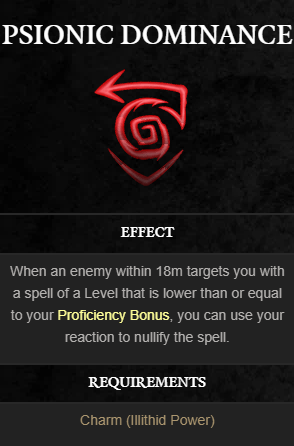 하지만 카운터펠의 막대한 비용으로 어려움을 겪고 있는 플레이어는 사이오닉 지배를 확보하는 것을 고려할 수 있습니다. 플레이어로부터 18m 이내에 있는 스펠 캐스터가 숙련도 보너스보다 낮거나 같은 스펠로 플레이어를 목표로 하면 반응으로 즉시 스펠을 무효화할 수 있습니다. 이것은 여러 명의 주문 시전자에게 유용하지 않을 수 있지만 무료 카운터펠 역할을 하는 사이오닉 지배는 플레이어에게 큰 이점을 제공할 수 있습니다.