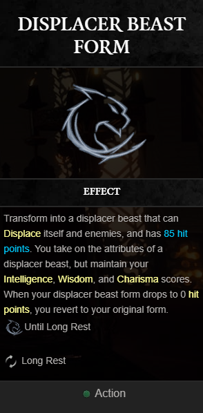 한번 변형되고 나면 플레이어는 긴 휴식을 취하거나 85 HP가 소진될 때까지 디스플레이서 비스트 셰이프로 남아 있습니다. 플레이어는 INT, WIS 및 CHA 점수를 유지하므로 이 형태는 주문 캐스터에게 이상적입니다.