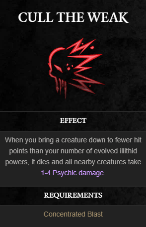 약자 컬링은 사용자가 상대를 기존 진화된 일리시드 파워보다 낮은 HP로 끌어내리면 즉시 적을 죽입니다. 그 뿐만 아니라, 이 즉시 죽이기 동작은 1d4 심령 데미지로 주변 생물에게 피해를 주는 공격도 해제합니다.