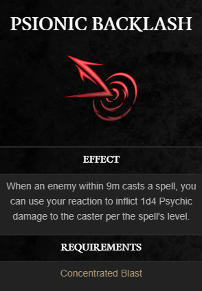 Psionic Backlash 덕분에 플레이어는 자신의 반응을 사용하여 9미터 반경 내에서 주문을 시전하는 상대에게 1d4 Psychic Damage를 입힐 수 있습니다. 뿐만 아니라 피해는 주문 레벨당 1d4씩 증가하여 사실상 보너스 공격에 해당하는 강력한 주문 사용을 처벌합니다.