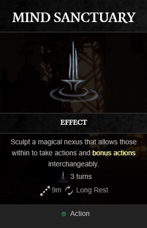 덕분에 이 일리시드 파워를 가진 플레이어인 마인드 생츄어리는 액션과 보너스 액션을 상호 교환하여 사용할 수 있는 마법의 결합을 생성합니다. 이렇게 하면 액션 비용이 많이 드는 무거운 동작을 사용하는 부담이 효과적으로 줄어들어 플레이어가 필요한 리소스의 일부로 더 강력한 기능을 사용할 수 있습니다.