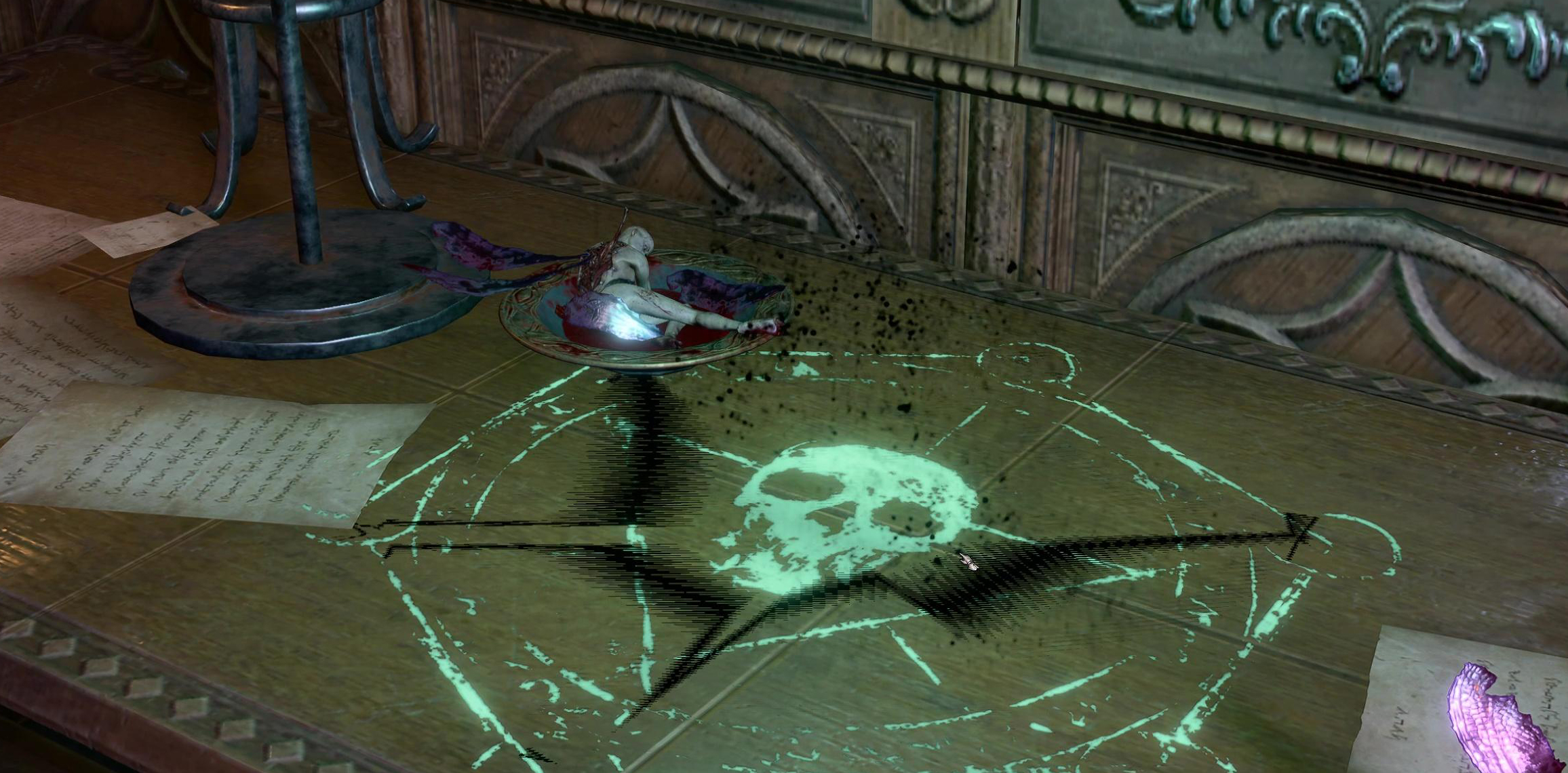 고대 제단에 심장을 놓으면 책장 뒤에 숨겨진 통로가 열립니다. 이 통로 안에는 발타자르의 비밀 강령술실이 있습니다. 파티에 게일과 함께 있지 않다면 빠르게 캠프로 돌아가 그를 데려가시길 바랍니다. 강령술 방에서 그와 독특한 상호작용을 할 수 있습니다.