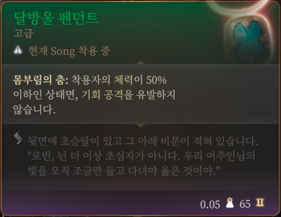 봉인을 풀고 궤짝을 열면 고급 아이템 달방울 펜던트를 획득할 수 있습니다. 이 펜던트는 착용자의 체력이 50% 이하인 상태면, 기회 공격을 유발하지 않는 특성을 가지고 있습니다.