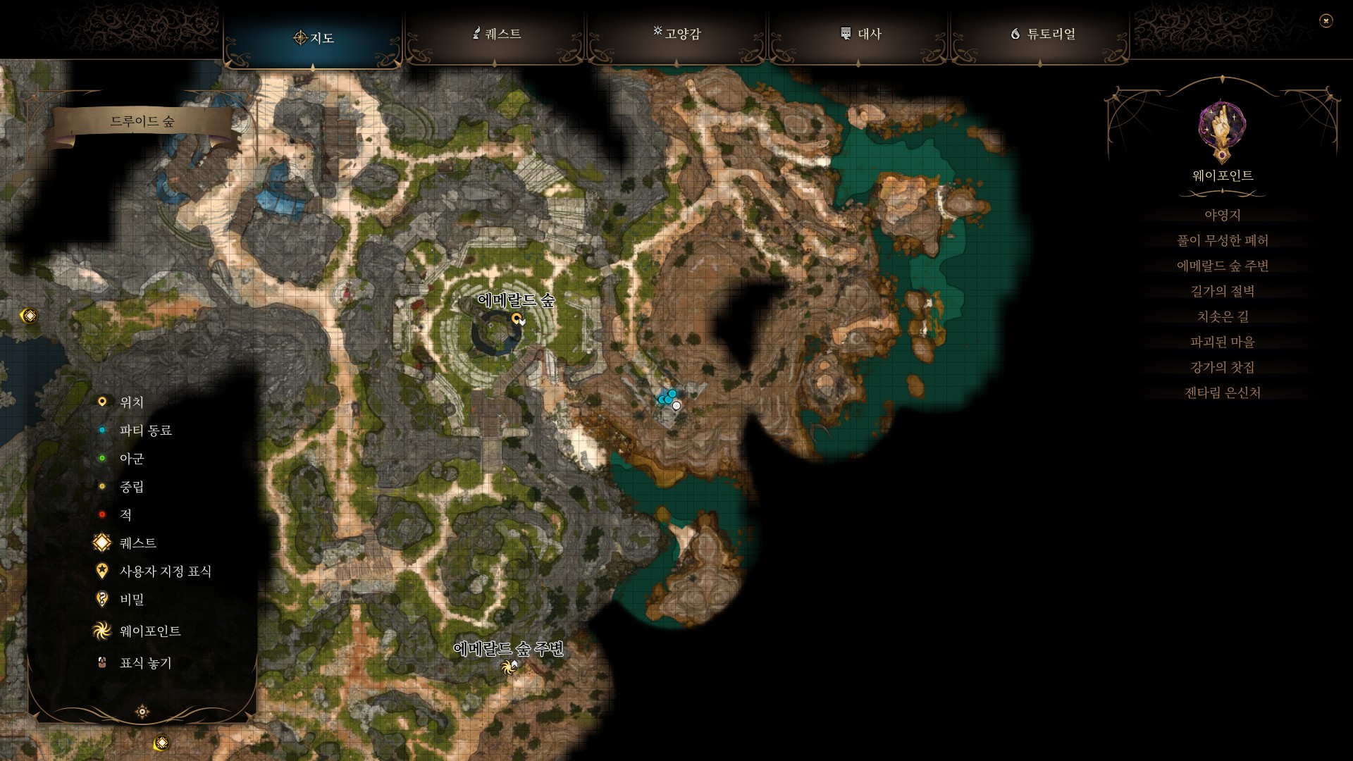 스토리를 진행하다 보면 도착하는 지도의 북동쪽에 위치한 에메랄드 숲 동쪽으로 위 지도를 참고하여 이동해주세요.