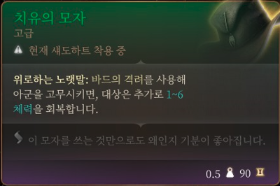 알피라와의 거래를 마친 후 맨 끝으로 가면 찬란한 궤짝을 찾을 수 있습니다. 락픽을 사용하여 상자를 열고(10 난이도) 치유의 모자를 획득하세요. 이 모자를 착용하면 위로하는 노랫말을 사용할 수 있습니다. 이는 아군을 고무시키면 해당 대상은 추가로 1d6 체력을 회복하므로 바드가 사용하는 것이 가장 좋습니다.
