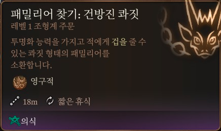 건방진 콰짓은 소환하는데 주문 슬롯이 들지 않으며 짧은 휴식 한번당 사용이 가능합니다. 콰짓은 다양한 패밀리어 소환수 중에서도 상위권으로 스스로 투명화를 걸 수 있으며 일정 확률로 대상을 2턴 동안 놀라게 할 수 있는 겁주기 능력을 가지고 있습니다. 이러한 군중 제어 능력은 전투에서 다수의 위험한 적을 마주할 때 강력합니다.