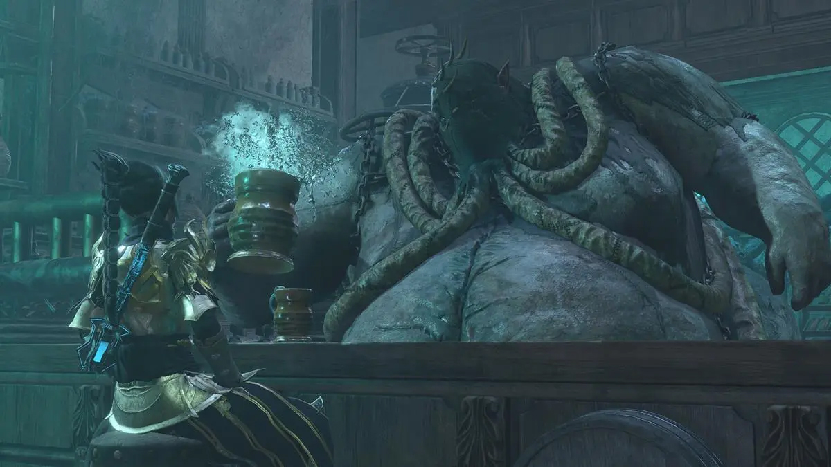 술을 마신 후에는 그에게 이야기를 들려주고, 그 후에는 다시 술을 마실 수 있는 옵션이 주어지며 그에게 몇 가지 질문도 할 수 있습니다. 케서릭에 대해 더 많은 정보를 요청하세요. 결국 그는 술을 마시고 죽게 됩니다. 이렇게 하면 메인 퀘스트 케서릭 쏨의 유물 찾기도 시작됩니다.