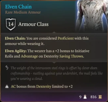 엘프 체인은 갑옷 클래스 14이며 최대 민첩 보너스 +2를 제공합니다. 이 갑옷에 제일 잘 어울리는 직업은 경갑 또는 중갑옷을 입을 수 없고 풍부한 민첩성의 부담을 받지 않는 순수한 주문 시전자 소서러 또는 위저드입니다. 동료 중에 제일 먼저 떠오르는 것은 게일입니다. 특히 주문 시전 능력을 향상시키는 로브 등을 착용하는 데 사용할 수 있는 갑옷 슬롯을 차지하기 때문입니다.