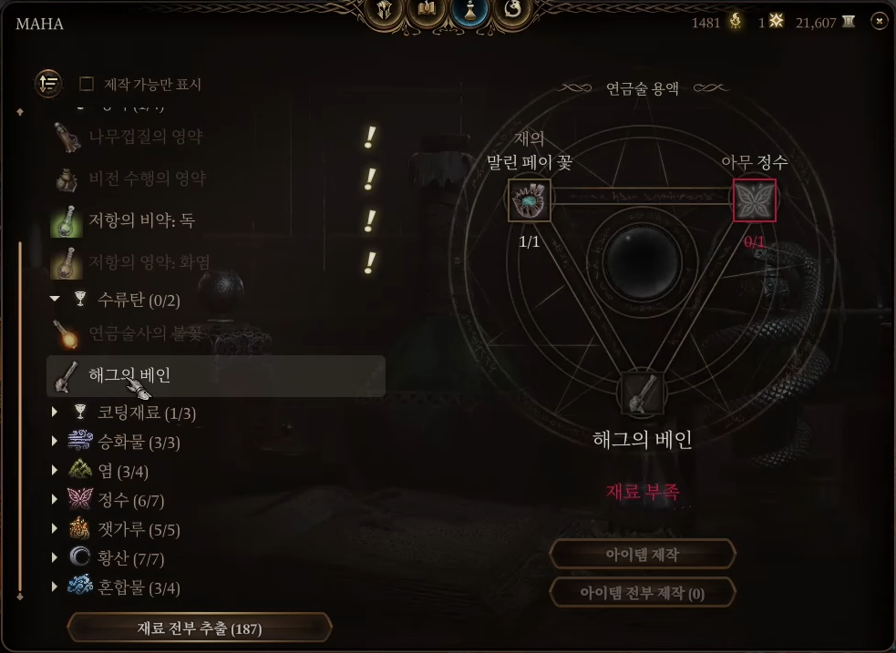 이후 H를 눌러 수류탄 탭에서 헤그의 베인을 조합해주세요. 필요한 재료는 말린 페이꽃의 재 1개(금고에 있음)와 아무 정수 1개(정수 탭을 이용해 아무거나 조합해도 됨)입니다.