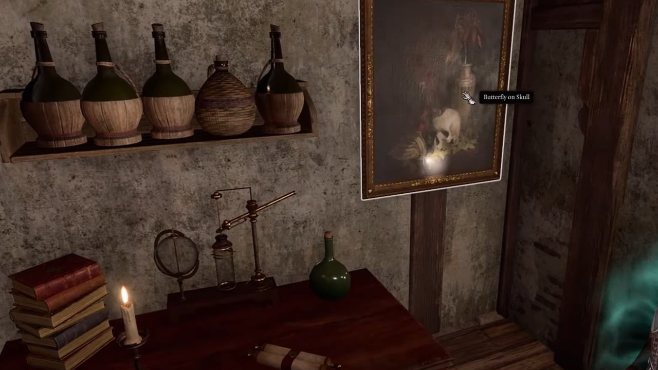 안으로 들어가 벽에 걸린 그림 해골에 나비를 떼어내면 뒤에 누를 수 있는 버튼이 나타나고 버튼을 누르면 뒤에 문이 나타납니다. 문과 상호 작용하고 "시카리우스"라고 말하세요.