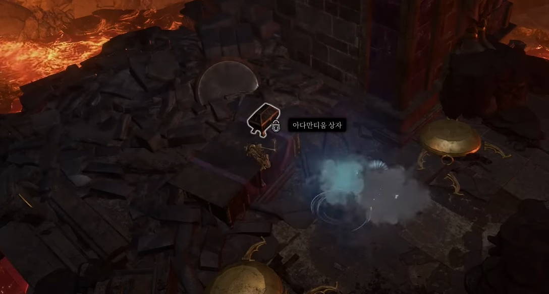 이후 밸브를 다시 열어 골렘이 과열된 상태가 됐다면 데미지를 주어 처치하시기 바랍니다. 이 골렘의 시체에서는 매우 희귀 장비인 그림스컬 투구를 획득할 수 있고 이제 편하게 아다만틴 장비를 제작할 수 있습니다.
