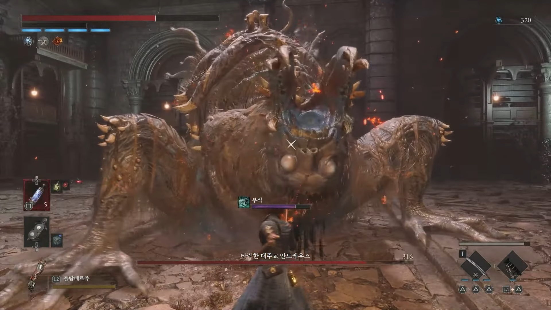 1~2페이즈 공통으로 타락한 대주교 안드레우스는 화염에 꽤 약한 모습을 보여 화염병 투척 하나에 4~500씩 까여나가는 걸 볼 수 있습니다. 무기에 화염 버프를 걸고 때리거나 불 데미지를 주는 플람베르주 리전 암을 활용하는 것을 추천드립니다.