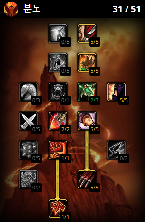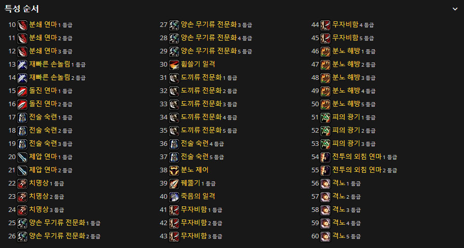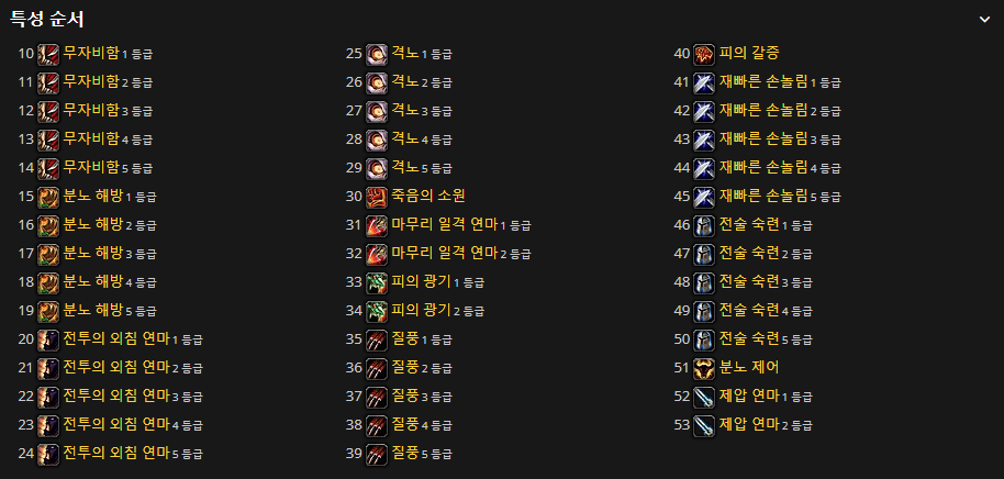 | 32 | 분쇄 / 광전사의 격노 / 전투의 외침 / 둔화 |