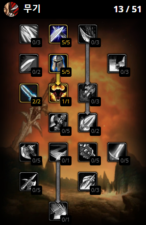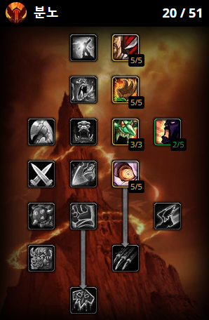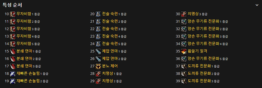 가장 권장되는 빌드는 분노 트리의 무자비함 5포인트으로 시작한 다음 무기로 교체하는 것입니다. 죽음의 일격을 제때 얻기 위해 전체 무기를 다시 지정하는 40까지 이 빌드에 머무릅니다. 또는 가능한 한 빨리 휩쓸기 일격을 원한다면 30까지 머무릅니다. 던전을 돌거나 파티 그룹에서 플레이하는 경우 권장합니다. 도끼류를 사용하지 않는 경우 도끼류 전문화의 포인트를 적절한 전문화 또는 재빠른 손놀림의 더 많은 포인트로 전환하세요.