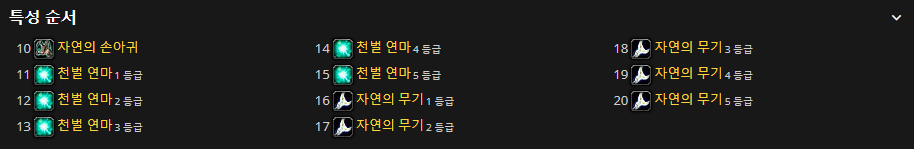 레벨 1부터 20까지는 이 빌드 순서를 추천합니다. 드루이드로서 레벨링이 가장 느린 부분에서 가능한 한 빨리 레벨링을 진행하는 동시에 높은 생존 가능성을 제공하는 가장 효율적인 방법입니다. 천벌의 스팸 최대 순위는 초기 레벨에서 가장 높은 DPS 출력이 될 것입니다. 초기 레벨에서 드루이드를 플레이하는 핵심은 아직 완전한 유틸리티가 없기 때문에 몬스터가 드루이드를 공격할 기회를 갖기 전에 먼저 몬스터를 쓰러뜨리는 것입니다.