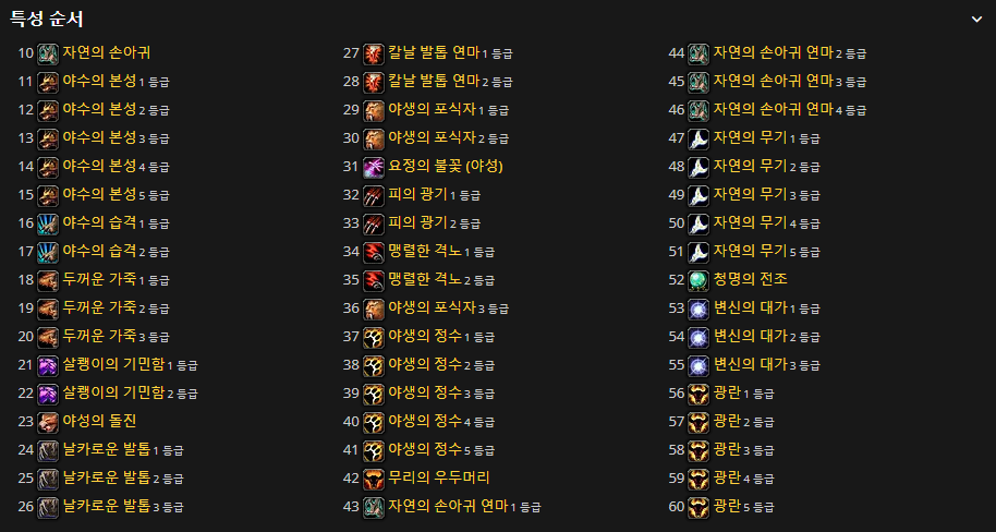 레벨 20이 되면 드루이드는 마침내 제대로된 게임을 플레이할 수 있습니다. 살쾡이의 기민함은 물론 야성의 돌진과 같은 유틸리티를 얻기 위해 야생 전투 트리의 우선순위를 낮추려면 특성 재설정을 활용하는 것이 좋습니다. 야성 드루이드는 레벨 32의 흉포한 경고와 함께 피의 광기 맹렬한 반발노 및 전역의 정수 와 같은 그에 어울리는 핵심 특성을 조합한 후 30대 중반에서 후반에 엄청난 전력 스파이크를 기록했습니다.