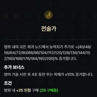 | 검의 달인 위상 | 시전 시 사용할 수 있는 주 자원에 따라 기술이 주는 피해가 최대 [10 - 20]% 증가합니다. 이 효과는 주 자원이 가득 찼을 때 최대 효과를 발휘합니다. |