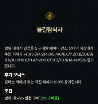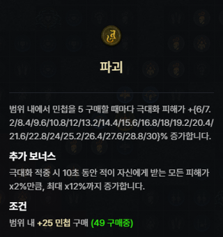 | 불복의 위상 | 어떤 형태로든 피해를 주면 방어도가 4초 동안 [0.25 - 0.50]% 증가합니다. 이 효과는 최대 [15.00 - 30.00]%까지 중첩됩니다. |