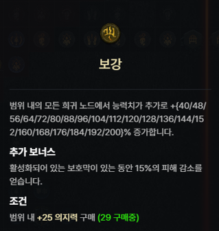 - 핏빛 보호대 (신성 1, 영원 1) - 적을 처치하면 기본 생명력의 6%만큼 보강됩니다. 보강 상태일 때 현재 생명력이 최대 생명력의 절반보다 높으면 8%의 극대화 확률을 얻습니다.