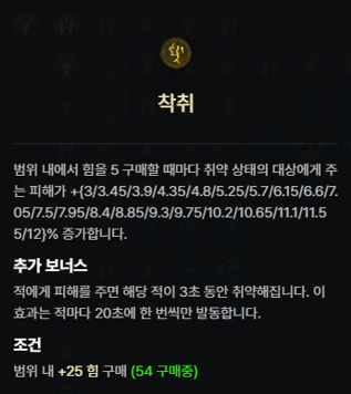 | 무기 슬롯 #2, 반지, 장갑 | 기대하는 자의 위상 | 적을 기본 기술로 공격하면 다음으로 시전하는 핵심 기술이 주는 피해가 [5 - 10]%만큼, 최대 30%까지 증가합니다. |