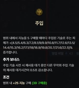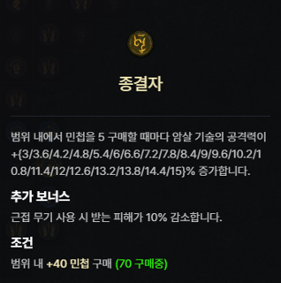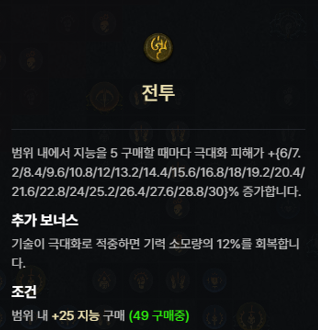 검의 달인 위상 | 시전 시 사용할 수 있는 주 자원에 따라 기술이 주는 피해가 최대 [10 - 20]% 증가합니다. 이 효과는 주 자원이 가득 찼을 때 최대 효과를 발휘합니다. |