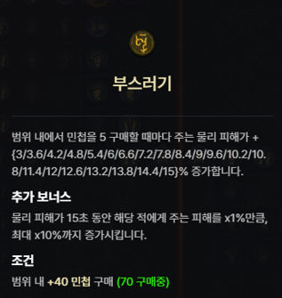 | 투구, 갑옷, 바지 | 불복의 위상 | 어떤 형태로든 피해를 주면 방어도가 4초 동안 [0.25 - 0.50]% 증가합니다. 이 효과는 최대 [15.00 - 30.00]%까지 중첩됩니다. |