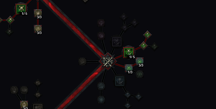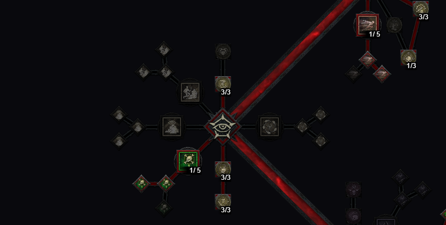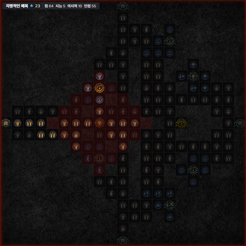 | 목걸이 | + 자원 소모 감소 + 악의 등급, 악용 또는 무기 마스터리 패시브 + 쿨다운 감소, 방어구, 이동 속도 + 피해 감소, 중독된 적, 원거리 적, 가까운 적 또는 부상당한 DR + % 민첩성 + 부상당한 적에 대한 치명타 확률 + 군중 컨트롤 지속시간 + 트랩 쿨타임 감소 + 데미지, 컷스로트 스킬 데미지, 양손무기 데미지 |