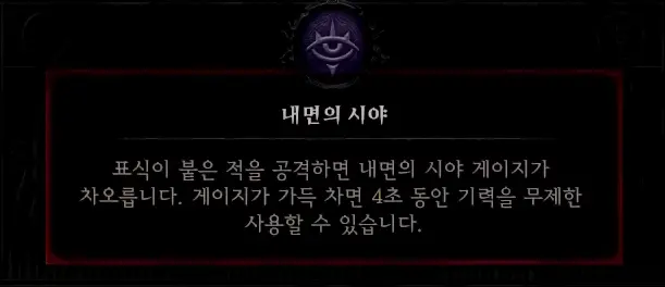 내면의 시야 : 표식이 붙은 적을 공격하면 내면의 시야 게이지가 차오릅니다. 게이지가 가득 차면 4초 동안 기력을 무제한 사용할 수 있습니다.