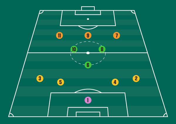 - 11번 또는 7번 - 왼쪽/오른쪽 미드필더(LM, RM): 윙어 또는 외부 미드필더라고도 알려진 이 선수들은 측면을 유지하면서 상대 수비를 바깥쪽으로 끌어당겨 공격 라인을 위한 공간을 만드는 데 도움을 줍니다. 그들은 상대 팀의 왼쪽 및 오른쪽 풀백 및/또는 윙백을 피해야 하므로 강력한 1대1 기술을 보유해야 합니다. 이러한 선수들은 경기 중에 공을 많이 소유하지 못할 가능성이 높지만 대신 공격적인 팀원에게 크로스 패스를 하거나 직접 골대에 슛을 가하여 공을 앞으로 전환하는 방법을 찾습니다. 그들은 게임 플레이를 따라잡기 위해 분주하고 충분한 체력을 가지고 있어야 합니다. 필드에서의 역할로 인해 윙어는 때때로 공격 또는 포워드 위치로 그룹화됩니다.
