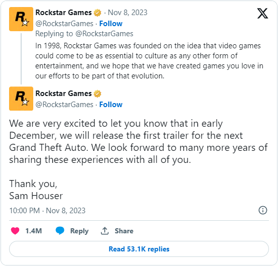 락스타게임즈가 한국 시각 8일 오후 10시 X를 통해 올해 12월 중 GTA 6의 공식 트레일러를 공개한다고 발표했습니다. 락스타게임즈의 공동 설립자이자 CEO인 샘 하우저는 오는 12월 락스타게임즈의 창립 25주년을 기념하며 GTA 6의 공식 트레일러를 공개할 예정이라고 전했습니다. 하지만 아직 출시일이나 가격, 배경 등에 관한 정확한 정보는 언급하지 않았습니다.