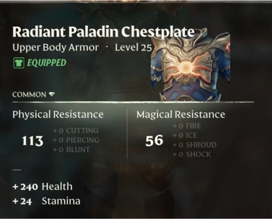 가슴 갑옷은 피해에 대한 저항력이 적당해야 하며 적의 공격을 막을 가능성을 높이기 위해 체력과 체력도 채워야 합니다. 최고의 성기사 빌드를 위해서는 Radiant Paladin Chestplate를 선택하는 것이 좋습니다.