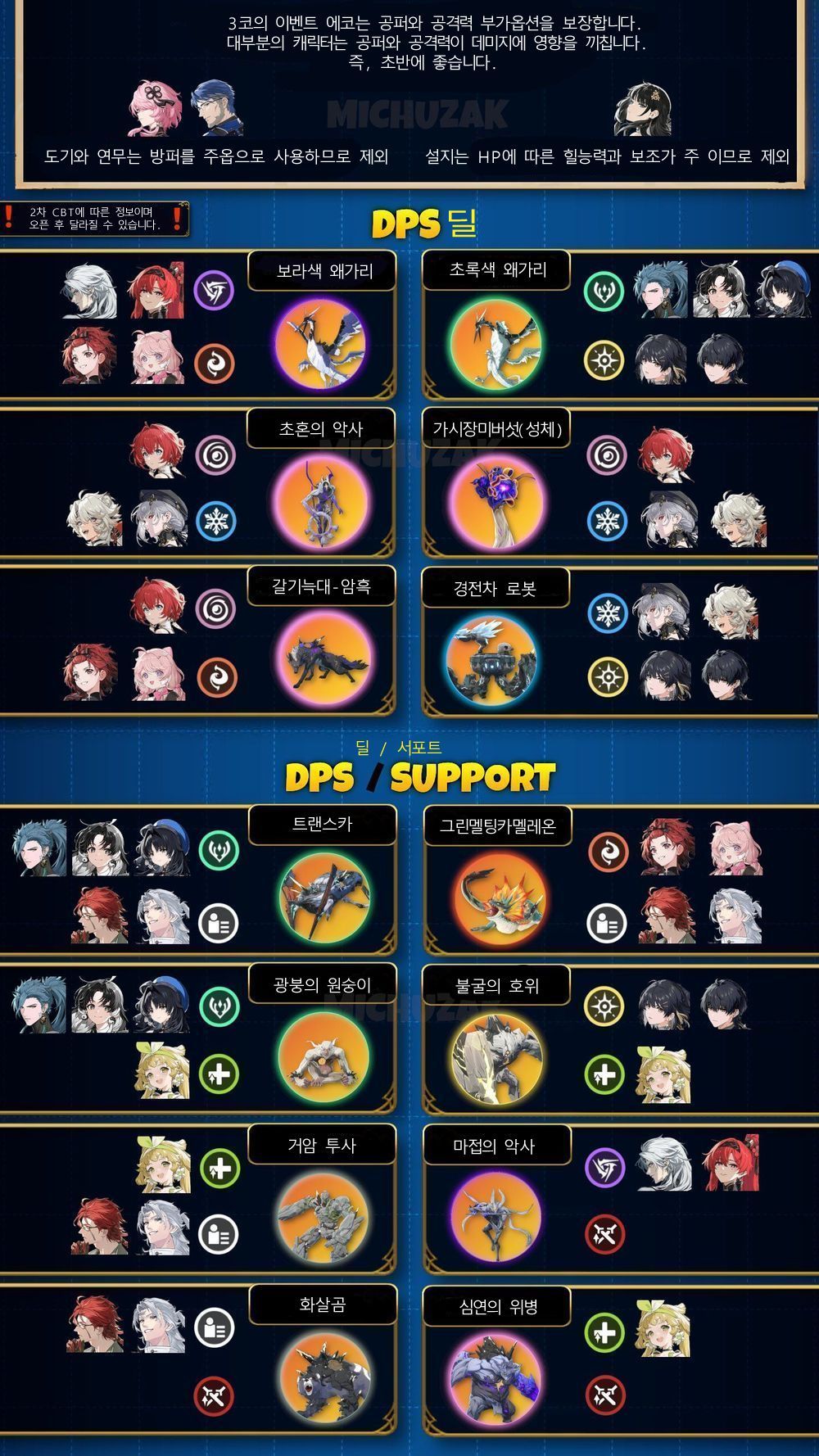 보라색 왜가리, 초록색 왜가리 둘 중 하나를 추천하며 해당 에코들이 5성 노란색으로 나올때까지 돌리시는걸 추천드립니다. (해당 추천 에코는 2차 CBT 기반이기 때문에 정식 출시한다면 달라질 수 있음)
