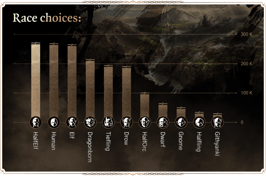 가장 많은 선택을 받은 종족은 하프엘프, 인간, 엘프 순서였습니다. 하프엘프는 호기심이 많고 야망 넘치며 유연한 종족으로 판타지 세계에 몰입할 수 있는 최고의 종족입니다. 그리고 픽률 마지막 순위가 기스양키인데 이후 통계에서 순위가 오를지 지켜봐야할 것 같습니다.