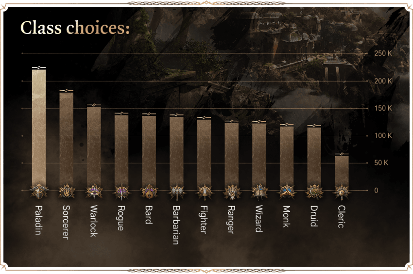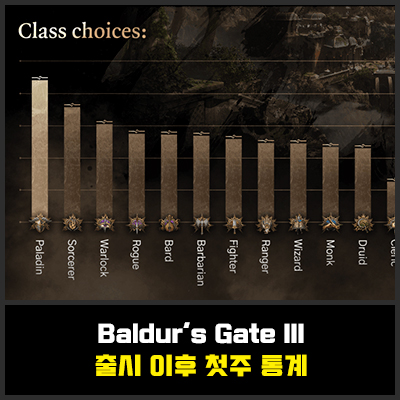 발더스 게이트3 출시 이후 첫주동안 가장 많은 선택을 받은 직업은 팔라딘입니다. 2위는 소서러이며 3위는 워락입니다.