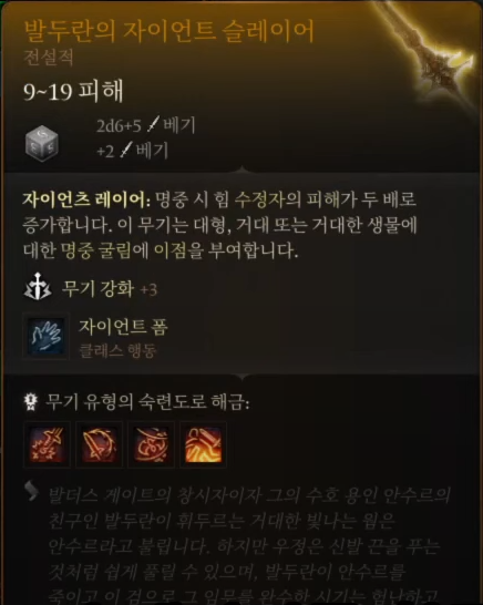 자이언츠 레이어 : 적중 시 힘 수정자의 피해가 두 배로 증가합니다. 크고 거대하거나 거대한 생물에 대한 공격 굴림에서 이점을 얻으십시오.