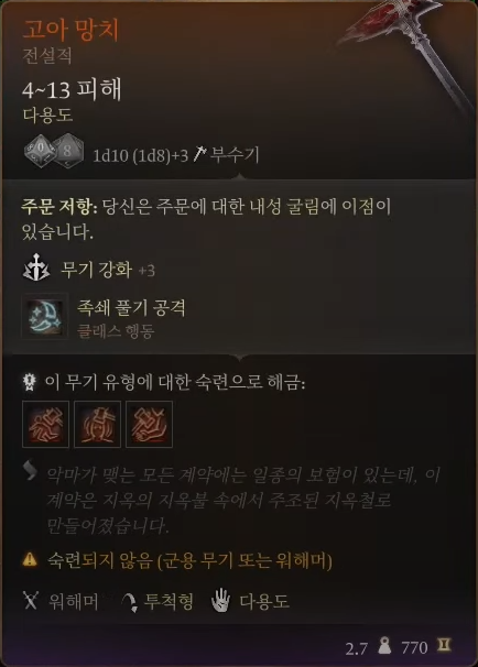 효과 : 손상 - 1d10(1d8) + 3번의 타격