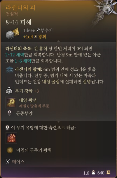 라샌더의 피(The Blood of Lathander)는 발더스 게이트3에서 얻을 수 있는 전설적인 메이스로 섀도하트같은 클레릭 직업에 아주 잘 어울리는 무기입니다. 이 무기는 잘 숨겨져있기 때문에 이번 공략을 통해 위치를 확인하고 획득하시길 바랍니다.